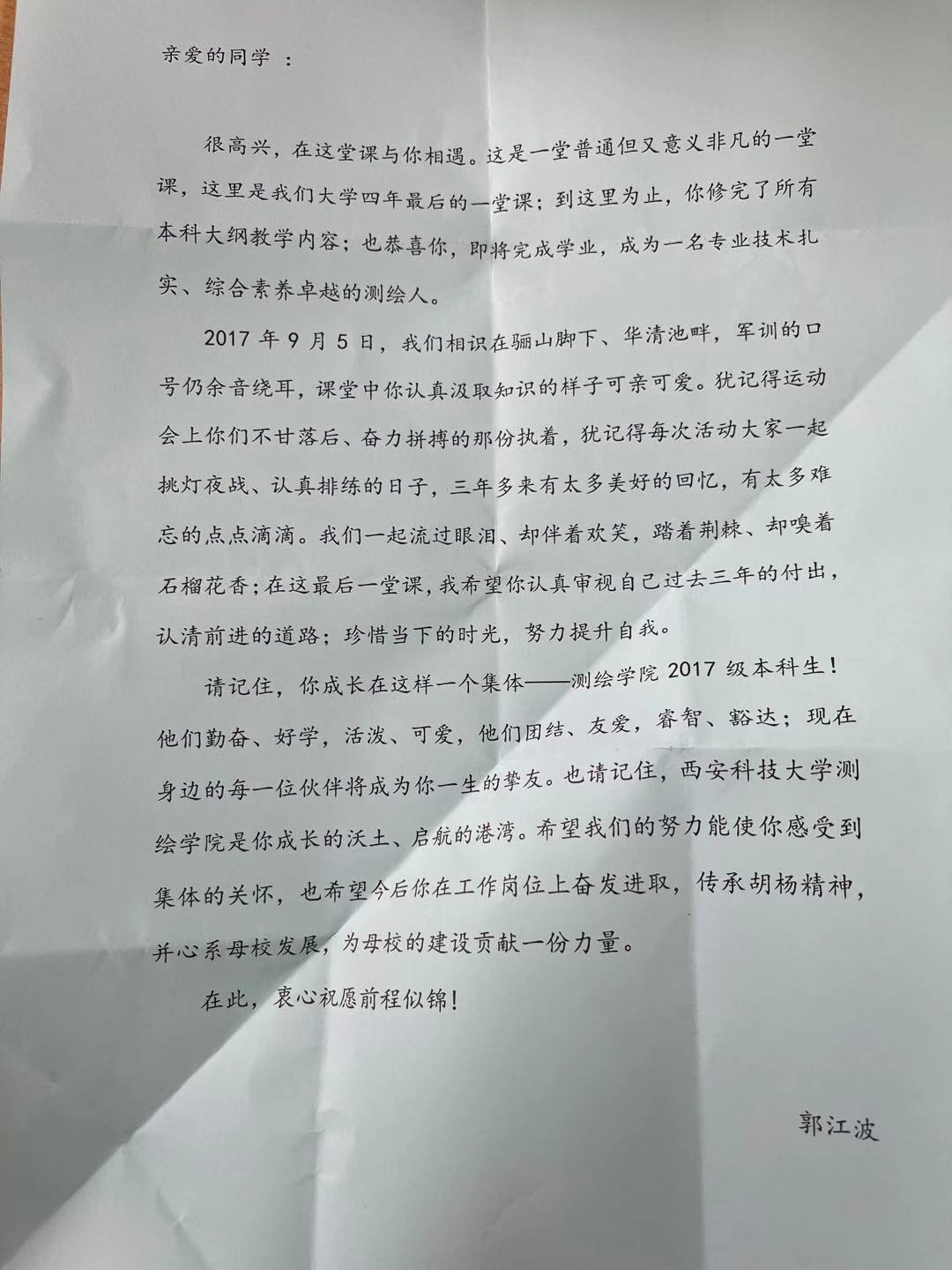 12月15日,365英国在线体育2021届毕业生迎来大学四年的最后一堂课,毕业生辅导员郭江波为员工送去祝福,希望这份努力使同学们感受到集体的关怀,也希望即将离校的员工们今后在工作岗位上奋发进取,传承胡杨精神,心系母校发展,为母校的建设贡献一份力量。