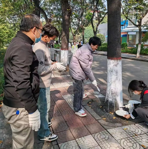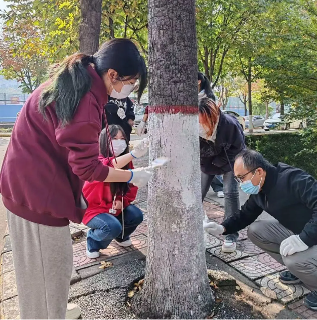 在初冬的阳光下,劳动的身影格外耀眼。同学们以饱满的热情投入到“白绘树干”的活动中,他们或低头专注,或相互协作,每一刷都蕴含着对校园的爱护与责任。