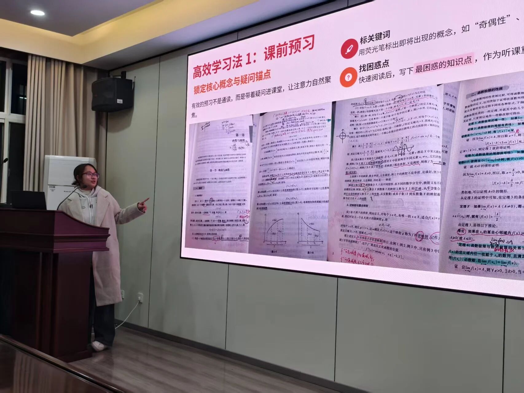 在分享环节中她强调,高效的学习方法是核心,明确考纲是重点并系统分享了预习、复盘、做题、资源利用这四大学习法,强调课后5分钟复述证明逻辑、建立错题本标记错误类型等具体技巧。针对函数极限求解、微分中值定理等难点,她结合典型例题深入剖析,特别提醒“等价无穷小替换只适用于乘除”等常见误区。