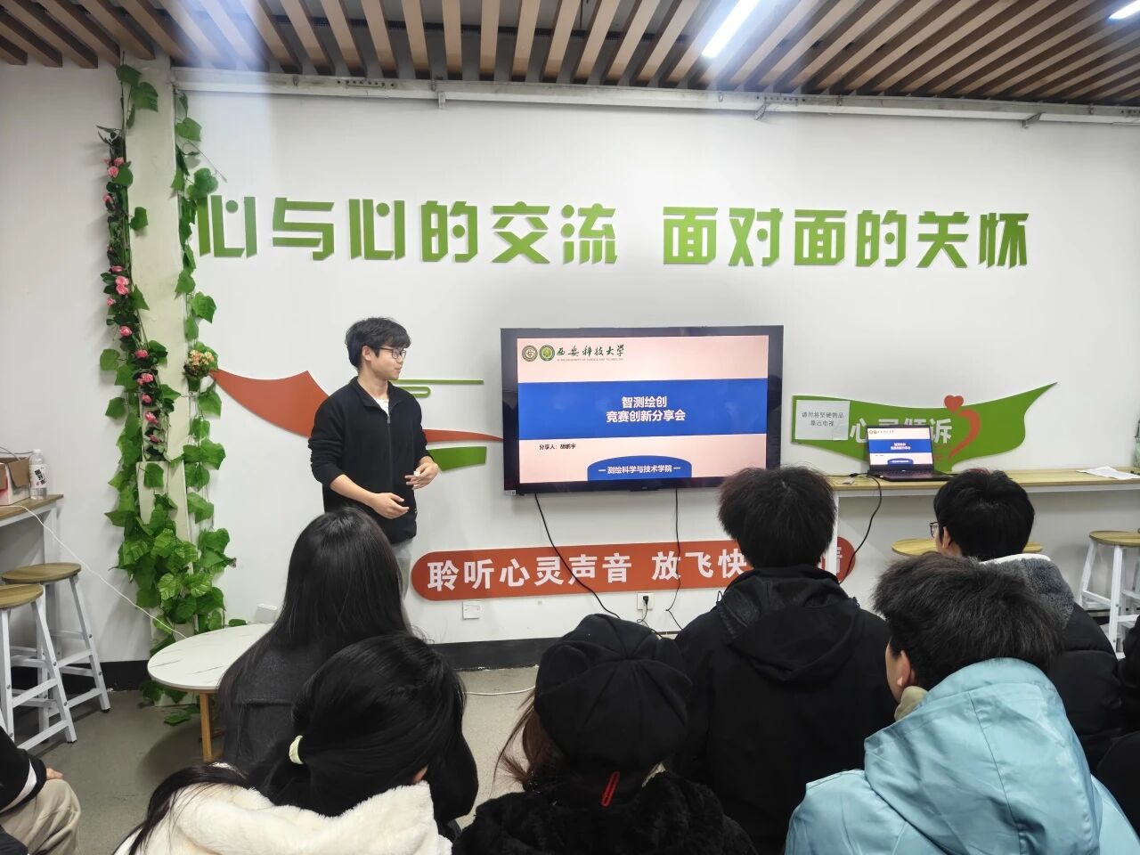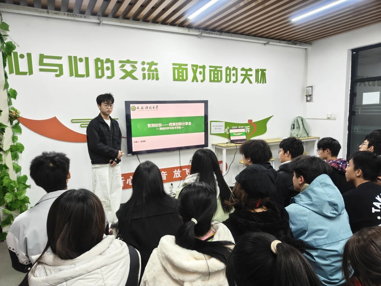 拆解竞赛完全链路,解锁科创高分密码。胡鹏宇同学以自身竞赛经历为切入点,以详实的项目案例为支撑,用深入浅出的讲解,完整分享了备赛心得与创新思路。他的分享逻辑严谨、内容实用:不仅系统拆解了“精准选题定方向、团队协作提效率、技术打磨求突破、成果转化显价值”的竞赛全流程路径,更结合测绘专业特色与行业前沿,详解了“专业知识+人工智能+遥感技术”的融合方法、“通感算智一体化”技术框架的搭建技巧,以及模块化分工推进项目的实操策略,为同学们点亮科创方向。