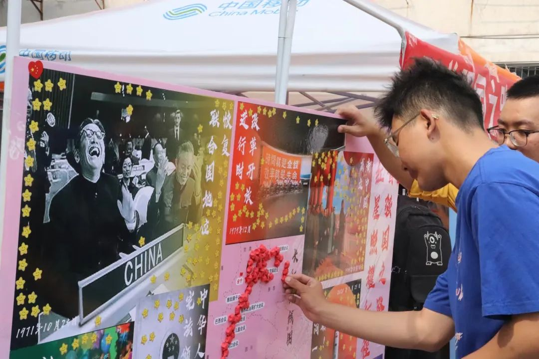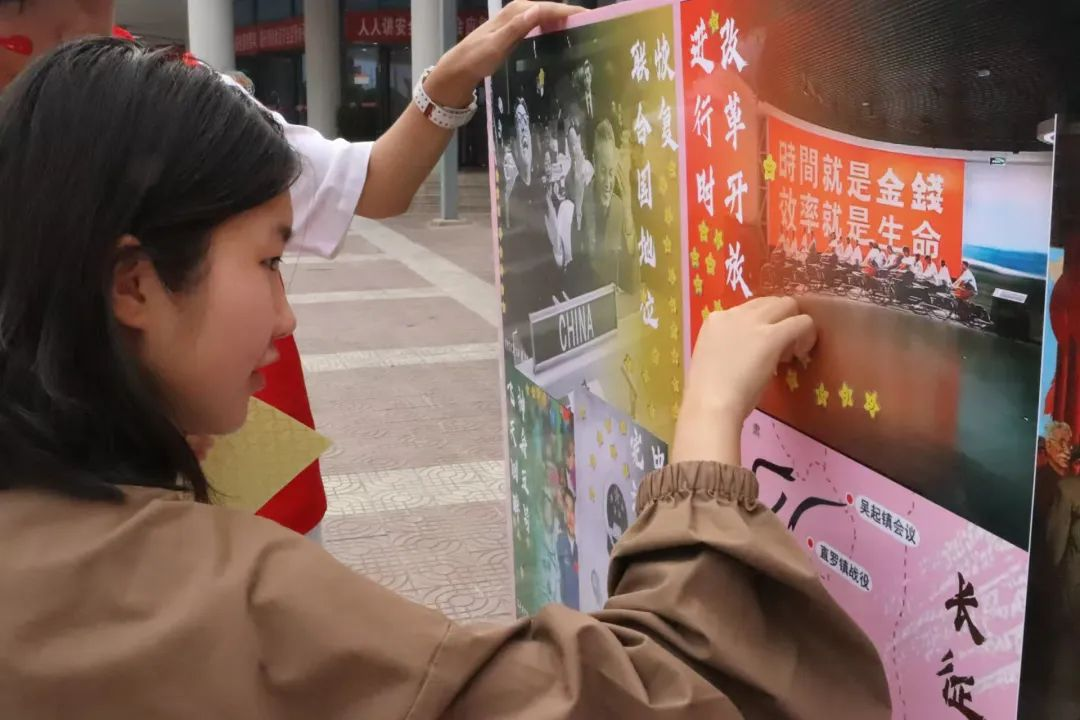 同时,将金黄色的五角星粘贴于展示建国以来国家重大历史事件的展板之上,同学们以这种方式”点亮“建国征程,表达同学们铭记历史,歌颂祖国的爱国情怀。每一颗星都象征着一段光辉历程,每一次粘贴都是对历史的深刻铭记与对祖国的崇高颂扬。