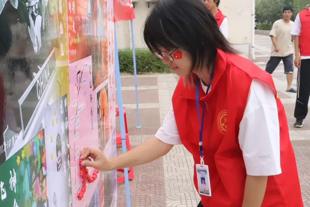 活动中,员工们以笔寄情,书写下对祖国的深情祝福与美好愿景。随后,这些承载着爱国热忱的纸条被折叠成红色五角星形状,逐一粘贴于展板的“长征路”上,象征着中华儿女团结一致、砥砺前行,为祖国的繁荣富强贡献青春力量。