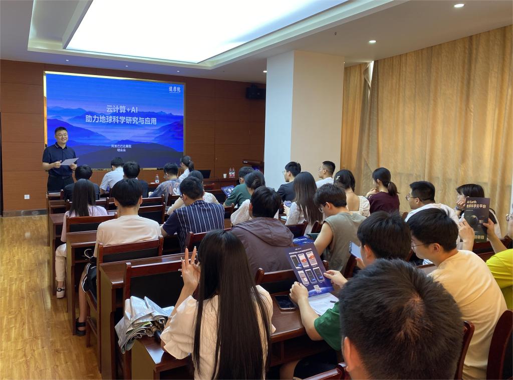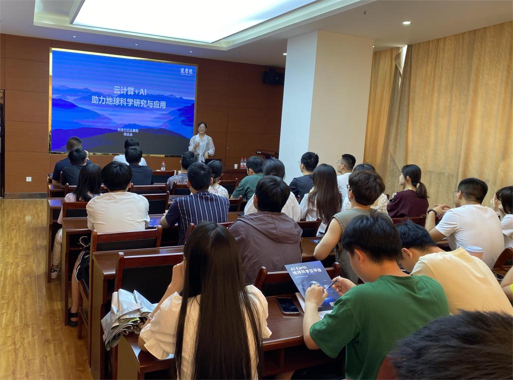报告会上,胡朵朵介绍了达摩院和AI Earth团队,从AI Earth团队、平台和科研布局等角度,讲解了AI Earth地球科学云平台,以及该平台在数据获取、在线分析处理、AI模型训练等领域的前沿进展。随后,胡朵朵介绍了AI Earth的合作与相关应用,展示了达摩院在算法、平台以及行业应用方面的强大实力和成功经验。最后,参会师生同报告专家展开了深入的交流和讨论。