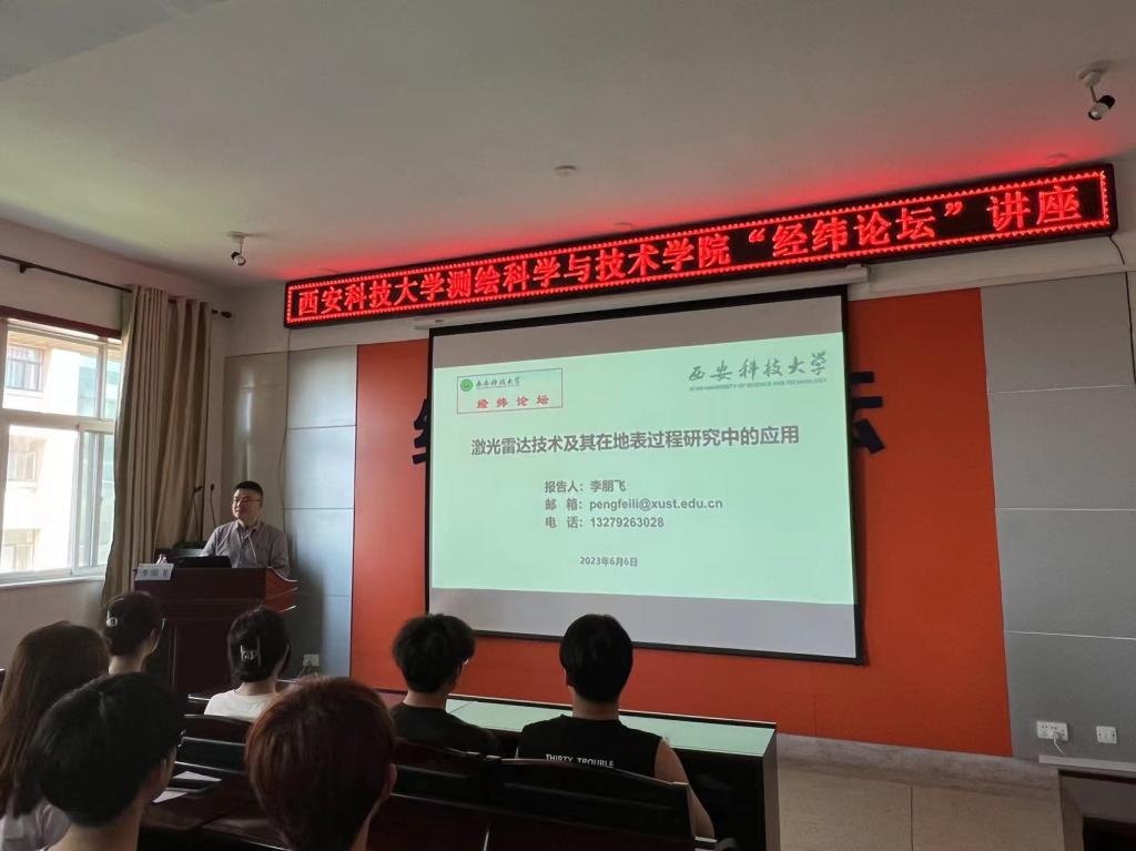 讲座上,李朋飞鼓励同学们积极创新,向大家分享了激光雷达技术的原理、数据处理、应用前景,就土壤侵蚀的类型、影响、过程与机理、研究方法、研究整体脉络与科学价值等进行深入的探讨,从研究区与试验设计、数据处理分析流程、地形变化监测算法研发等对激光雷达技术在水土流失监测中的应用进行了案例分析,对多尺度遥感监测方法进行了展望。
