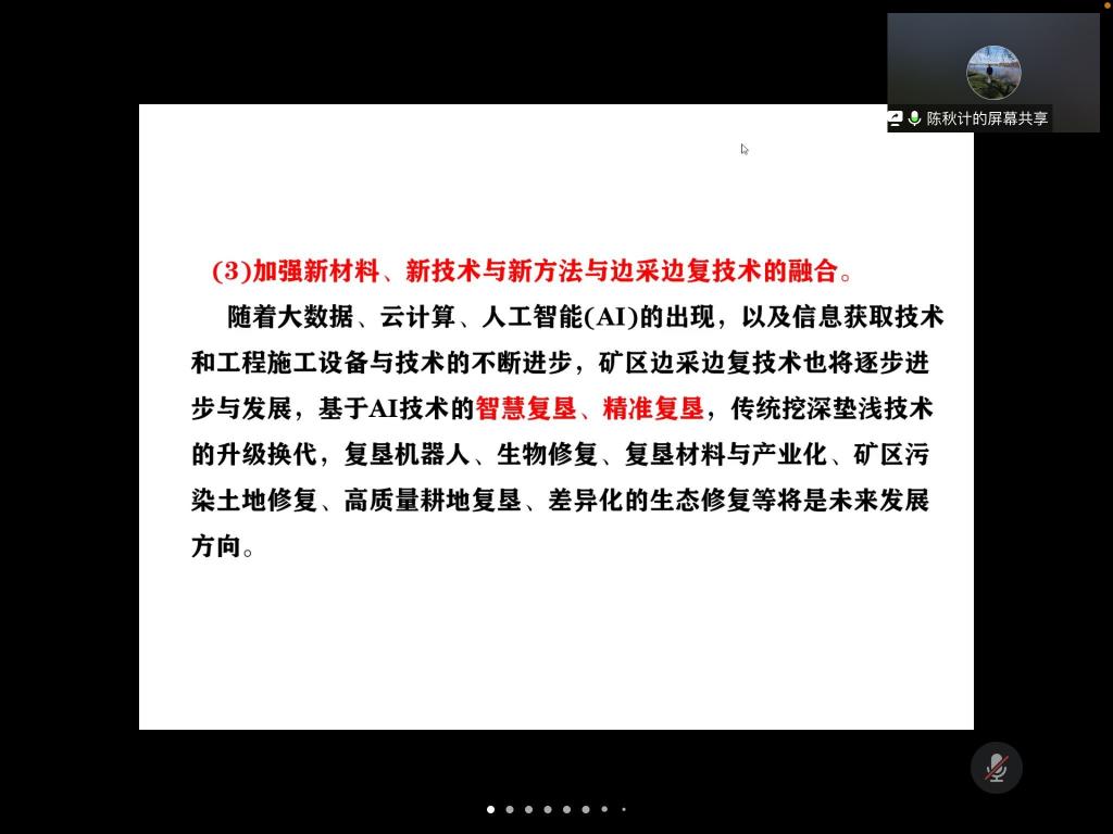 1月18日上午,陈秋计老师作了题为《矿山生态修复进展》的报告。陈老师将矿山生态修复领域团队研究成果和目前前沿阵地的研究相结合,为研究生讲解了当前矿山生态修复工作的国内外研究现状和待解决的问题,帮助研究生提高寻找论文切入点的能力,开拓了研究生的科研视野。
