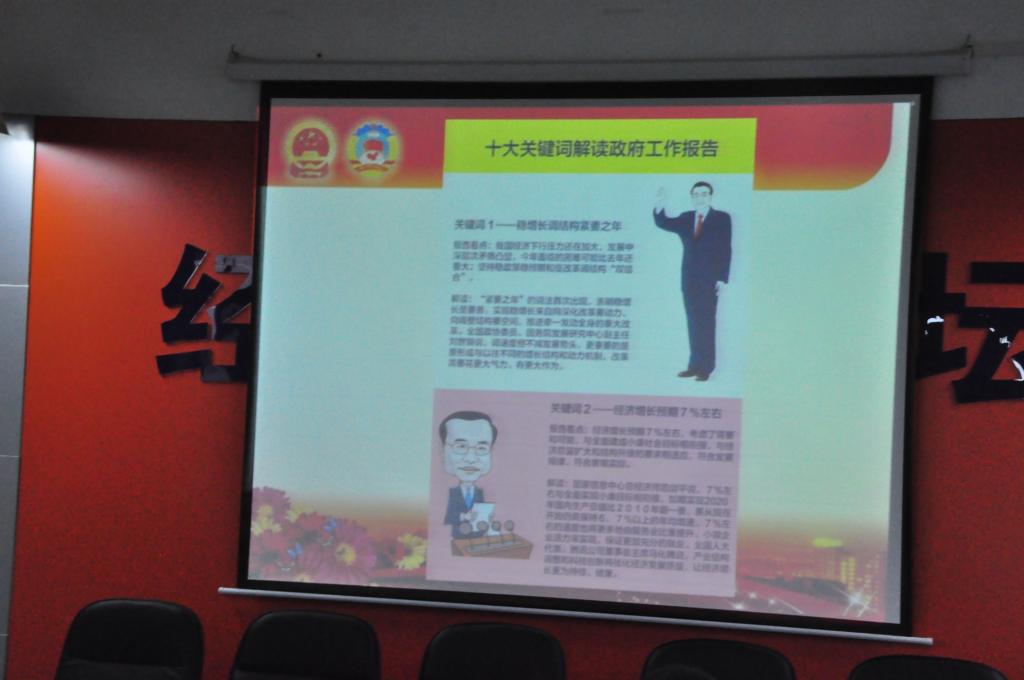 张雷老师从两会的基本知识、2016年政府工作报告解读、2016年两会热点解读做了细致阐述。会议最后,张雷老师表示国家的发展离不开我们每一个人的努力和付出,个人的发展需要国家提供环境和保障,两者相辅相成,不可分割。作为当代老员工,肩负祖国发展前进的伟大使命,必须深入贯彻落实两会精神,同学们应该在学习与讨论中共同进步,力求做一名具备良好思想觉悟的新一代合格老员工。