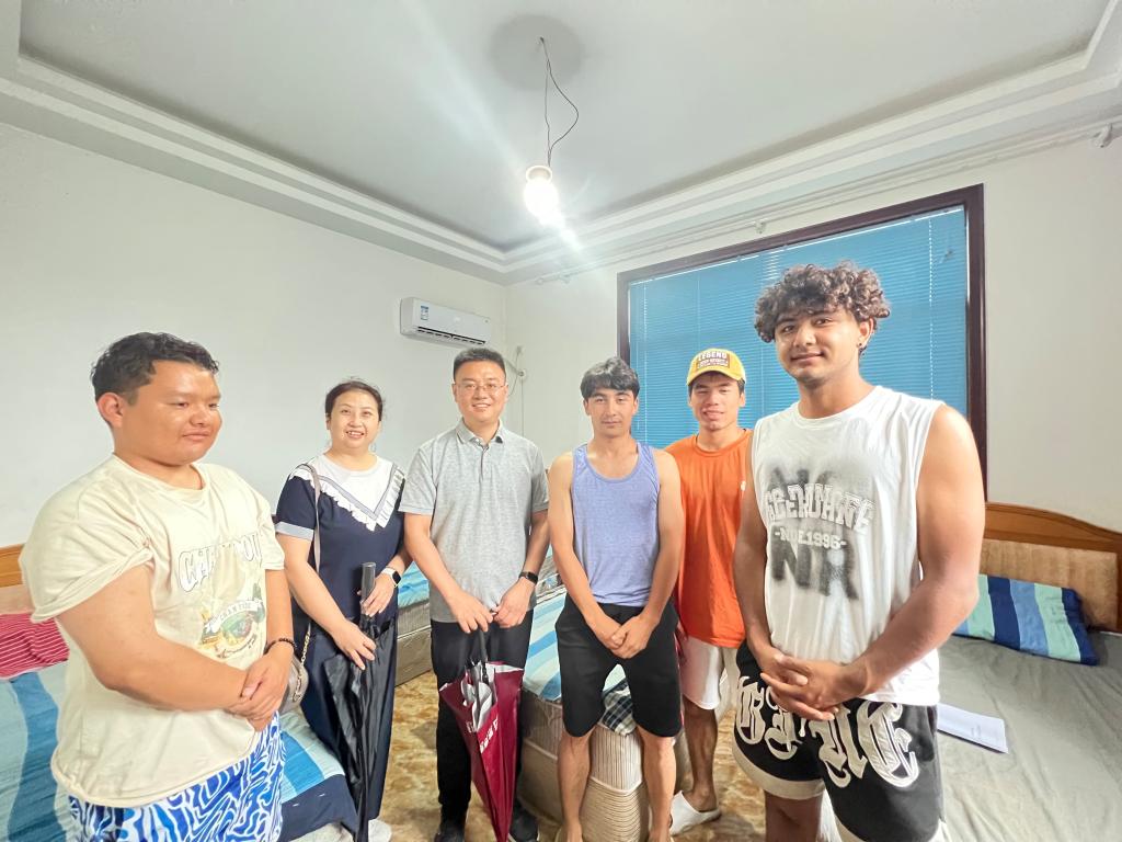 在焦岱镇鲍旗寨实习基地,李朋飞一行看望了开展各类实习任务的师生们,调研了少数民族员工在基地住宿、饮食等生活情况,提醒同学们遵守实习基地要求,珍惜实习机会。同时,他肯定了带队老师对实习工作的辛苦付出,要求老师做好员工安全防护工作,确保野外实习顺利完成。