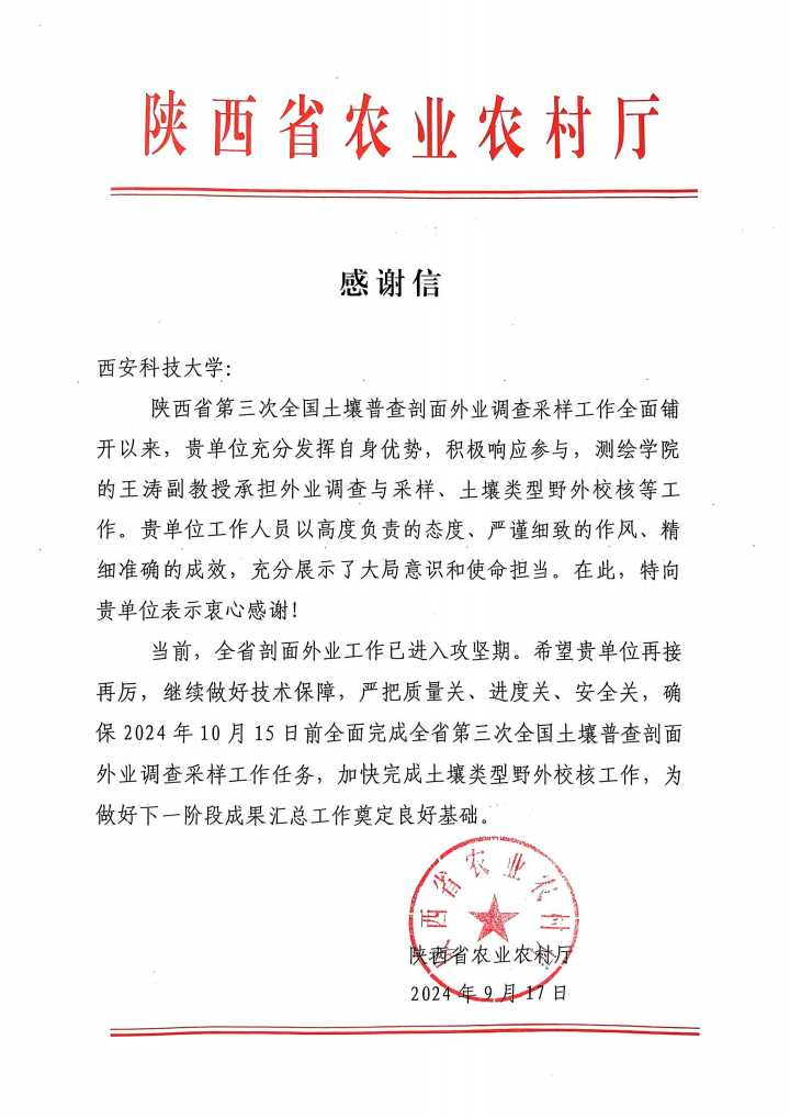 2024年9月17日,陕西省农业农村厅向365英国在线体育发来一封感谢信,高度赞扬了该校在陕西省第三次全国土壤普查剖面外业调查采样工作中所展现出的卓越贡献和专业精神。