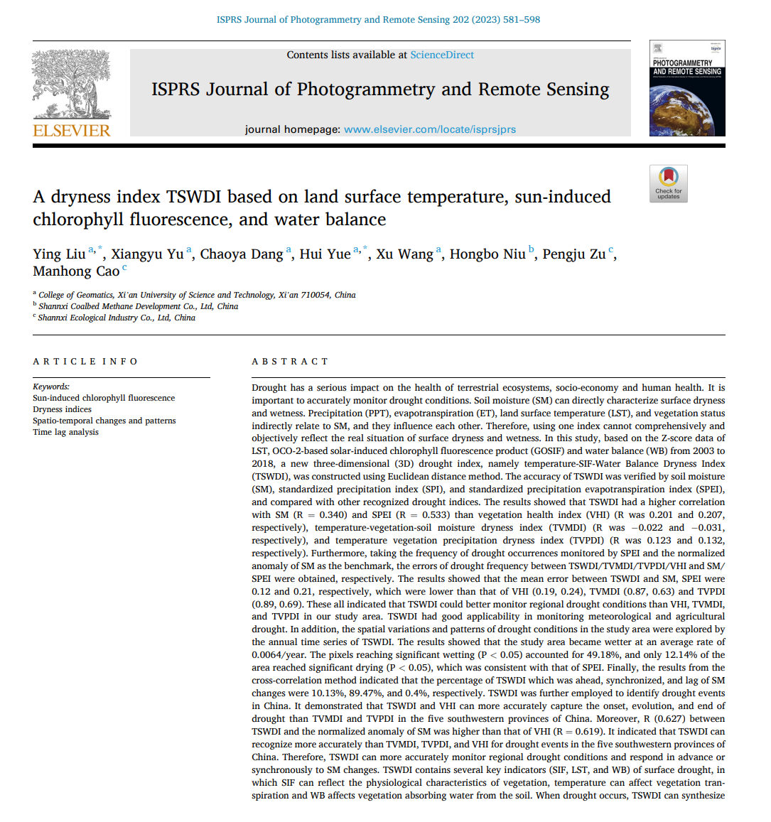 近日,365英国在线体育矿区定量遥感研究团队刘英、于翔宇(硕士研究生)、党超亚(硕士研究生)、岳辉等,在《ISPRS Journal of Photogrammetry and Remote Sensing》(P&RS)发表了题为“A dryness index TSWDI based on land surface temperature, sun-induced chlorophyll fluorescence, and water balance”的研究论文。ISPRS Journal of Photogrammetry and Remote Sensing(P&RS)是国际摄影测量与遥感学会(ISPRS)的官方期刊。P&RS被公认为遥感领域最具权威性的国际期刊之一,2022年最新影响因子为12.7,5年影响因子为12.4,该杂志为所有国家从事摄影测量、遥感、空间信息系统、计算机视觉和相关领域的许多学科的科学家和专业人员提供了一个交流渠道,旨在作为这些学科进展的来源参考和档案。