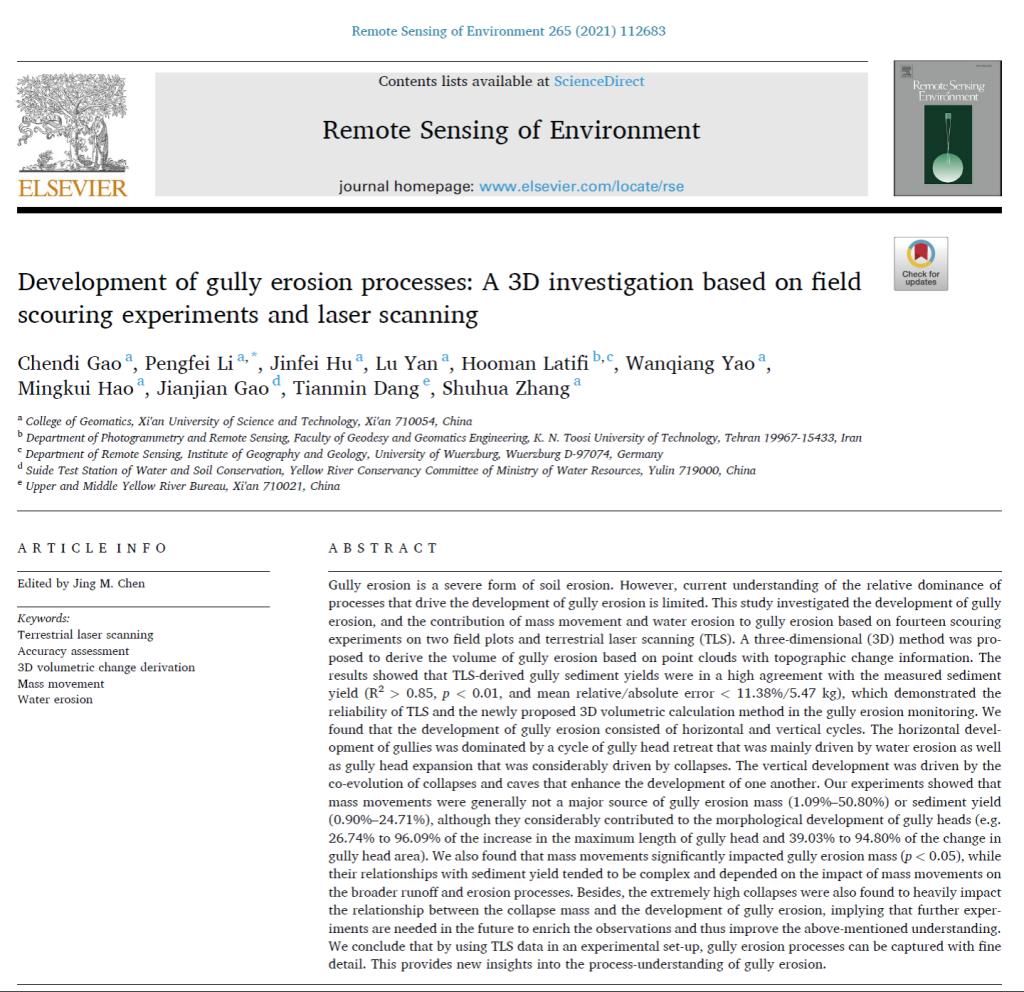 ​365英国在线体育地貌遥感与水土保持研究团队高晨迪(博士研究生)、李朋飞、胡晋飞、姚顽强等日前在《Remote Sensing of Environment》(RSE)发表了题为“Development of gully erosion processes: A 3D investigation based on field scouring experiments and laser scanning”的研究论文。RSE被公认为遥感领域最具权威性的国际期刊之一,2021年最新影响因子为10.164,5年影响因子为11.057,主要发表有关遥感的理论、科学、应用和技术的原创成果。