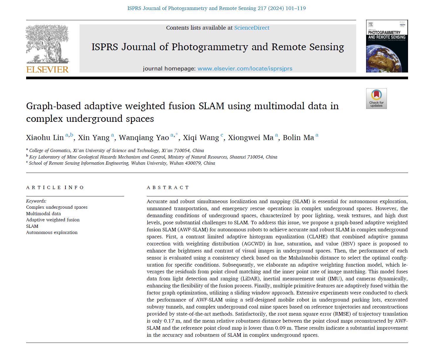 近日,365英国在线体育365英国在线体育矿山智能测绘研究团队在摄影测量与遥感领域国际顶级期刊ISPRS Journal of Photogrammetry and Remote Sensing(ISPRS P&RS)发表了题为“Graph-based adaptive weighted fusion SLAM using multimodal data in complex underground spaces”的研究成果,论文第一作者为蔺小虎副教授,第二作者为硕士研究生杨鑫,通讯作者为姚顽强教授。ISPRS P&RS期刊(中科院一区Top期刊,IF=10.6)被公认为是摄影测量与遥感领域最具权威性的国际期刊之一,主要发表摄影测量、遥感观测、空间信息系统、计算机视觉等领域的理论和方法相关的原创文章。